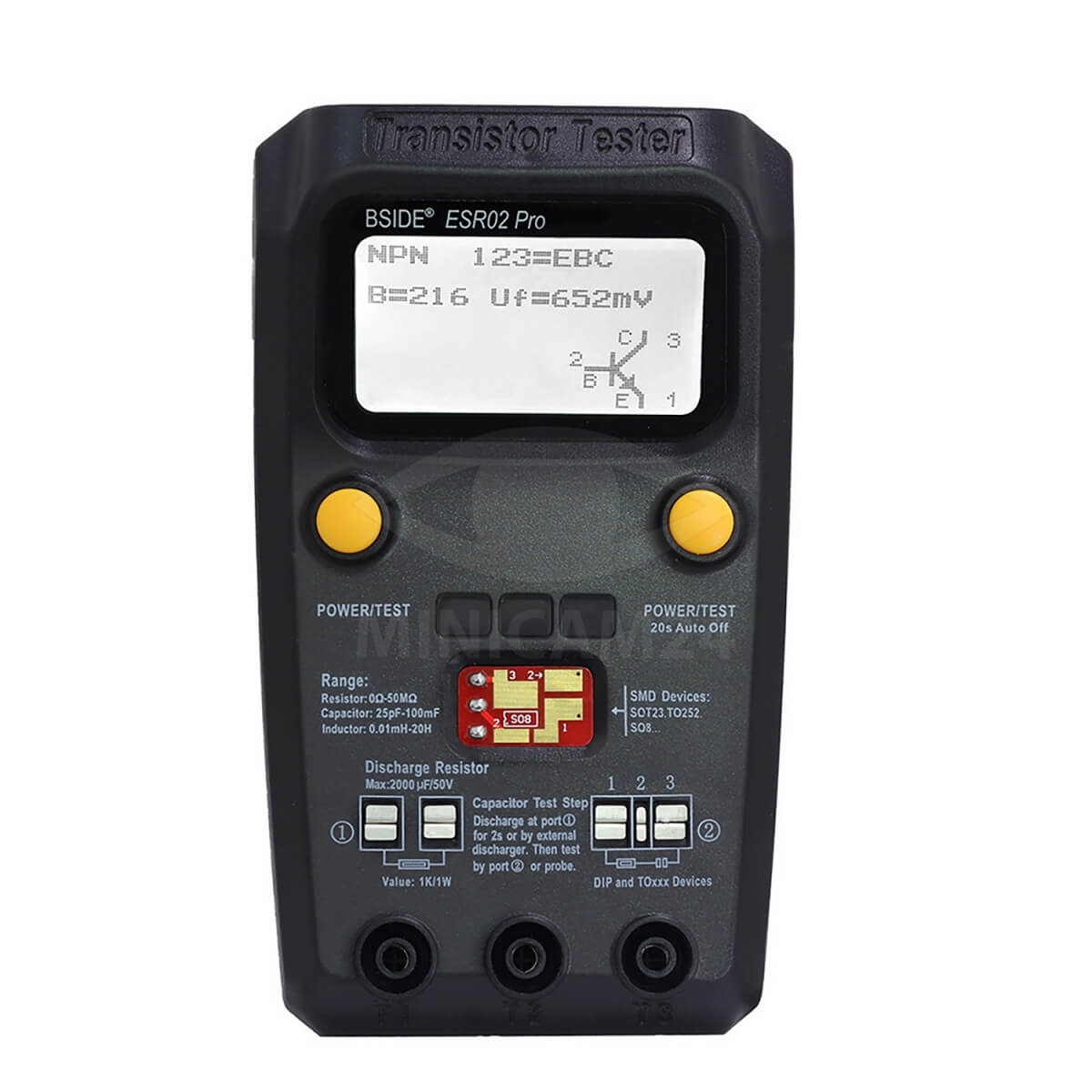 BSIDE ESR02PRO портативный тестер, предназначенный для инженеров и специалистов по электронному обслуживанию оборудования. Тестер значительно облегчает работу с компонентами для поверхностного и сквозного монтажа, а также тестировать различные типы диодов, тиристоров, МОП- транзисторов и прочие. Преимущества: Автоматическое определение типов: биполярных транзисторов NPN и PNP, полевых МОП-транзисторов с N- и P-каналом, полевых транзисторов JFET, диодов, двойных диодов, тиристоров и триаков. Измерение коэффициента усиления биполярных транзисторов (hFE) Измерение порогового напряжения база-эмиттер биполярных транзисторов. Обнаружение защитного диода биполярных транзисторов и полевых МОП-транзисторов. Измерение порогового напряжения затвора и значения емкости затвора MOSFET транзисторов. Время измерения: около 2-х секунд (для больших конденсаторов и индуктивностей может быть больше). Три контейнера для размещения мелких компонентов. Гнездо для различных типов корпусов деталей. Гнездо для разряда конденсаторов. Таблица качества электролитических конденсаторов по значению ESR (для справки) на задней крышке.